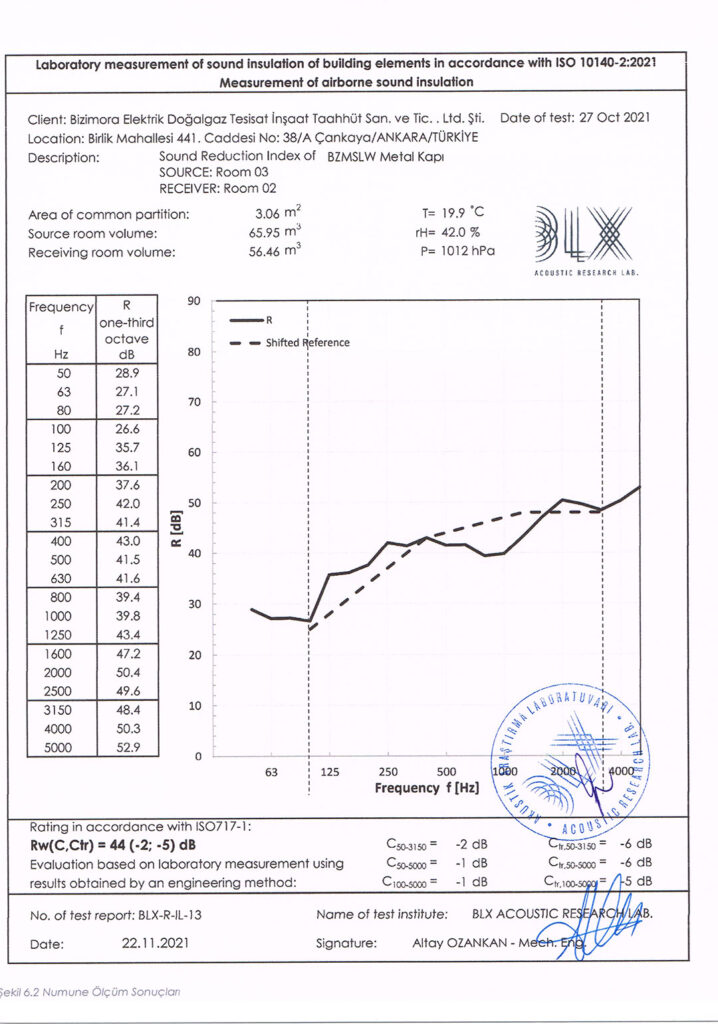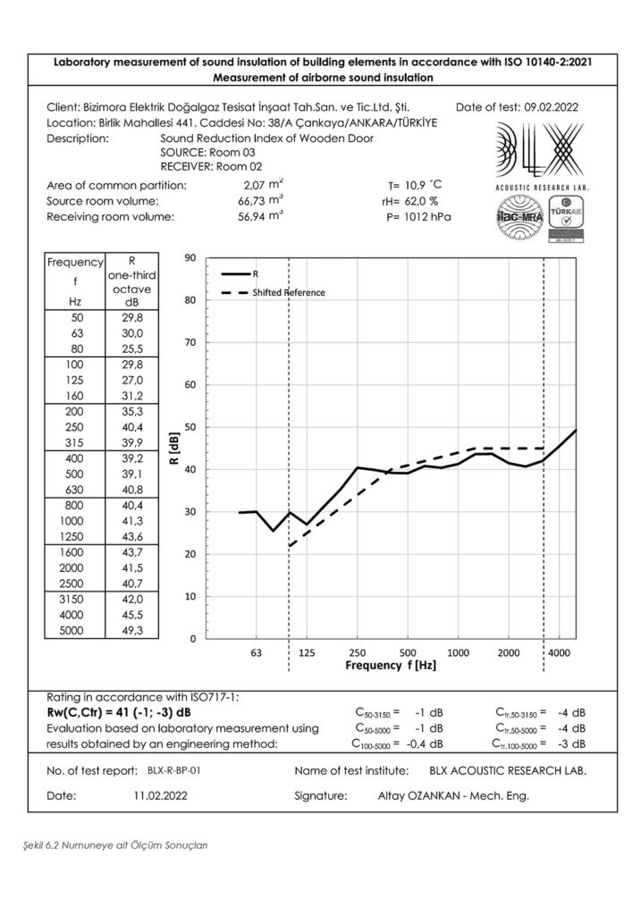 Müşteri memnuniyetini ve güvenliği en üst düzeye çıkarmak adına, ses yalıtımlı kapılarımız uluslararası standartlara uygun olarak sertifikalandırılmıştır. 45 desibel ses kesme özelliği sertifikası, ürünlerimizin yüksek kalitede ve güvenilir performans sunduğunu doğrular.